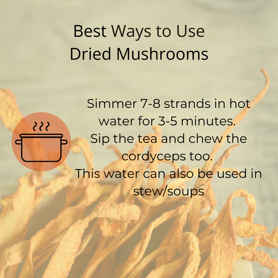 Simmer 7-8 strands in hot water for 3-5 minutes. Sip the tea and chew the cordyceps too. This water can also be used in stew/soups.